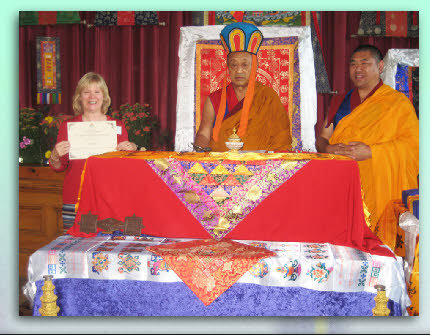 Cheri was a member of the first graduating class of fifty practitioners who graduated in June, 2010 after receiving their final transmission from His Holiness of Bön, 33rd Menri Trizin Lungtok Tenpai Nyima, Spiritual Leader of the Bön.